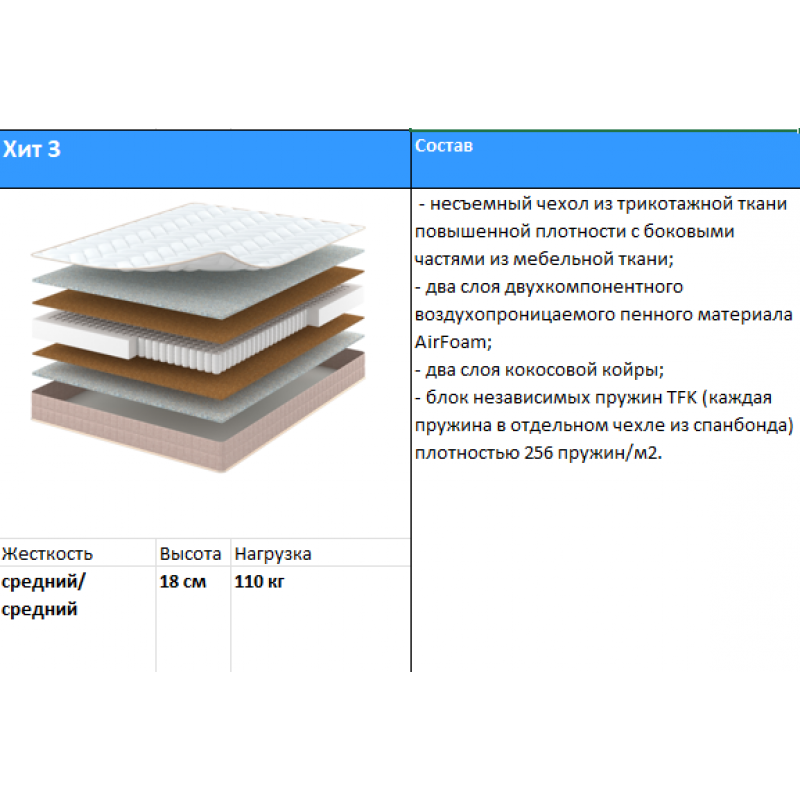 - блок независимых пружин TFK (каждая пружина в отдельном чехле из спанбонда) плотностью 256 пружин/м2.