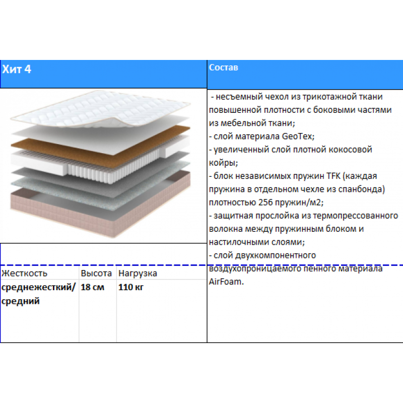 - блок независимых пружин TFK (каждая пружина в отдельном чехле из спанбонда) плотностью 256 пружин/м2;