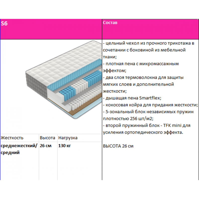 - 5-зональный блок независимых пружин плотностью 256 шт/м2;